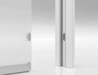 • Уплотнители и ответные части, которые активируются при закрытии звукоизоляционной двери, герметизируя вертикальные части дверного проема, предотвращая проникновение звука.