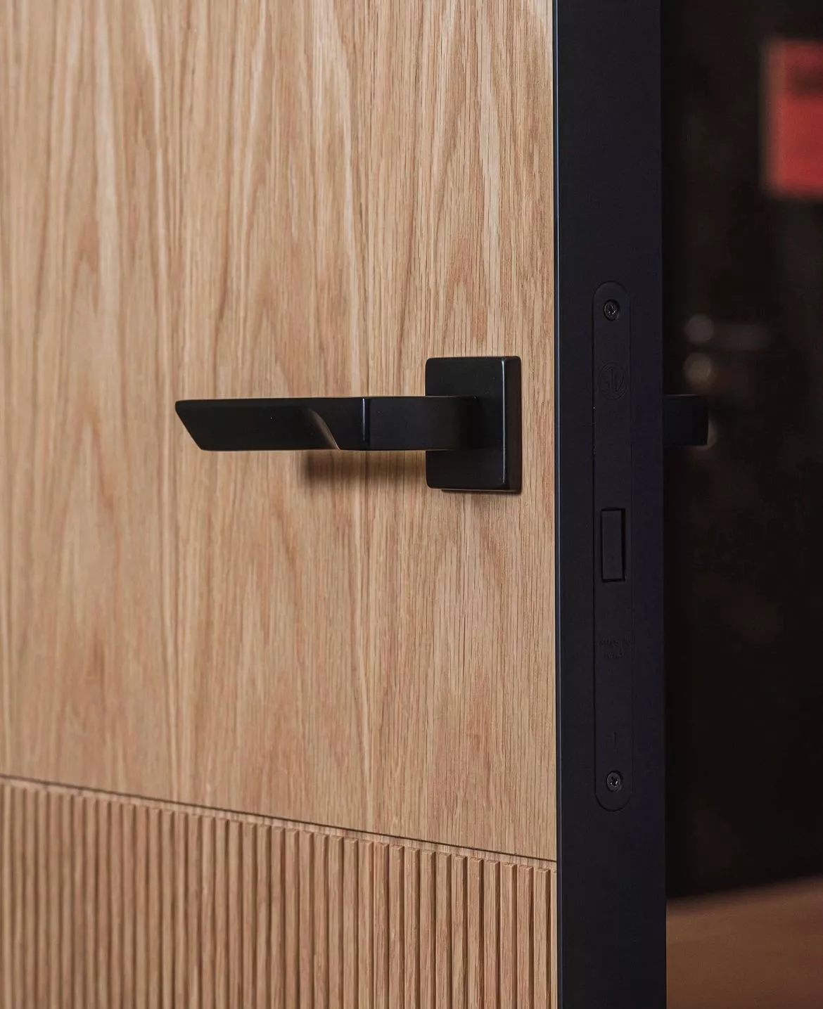 • Реечные двери: Глухие полотна с накладными вертикальными рейками, стеновые панели в идентичной раскладке (эффект «скрытой двери»).
